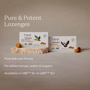 Tahi Mānuka Honey UMF™ 8+ Lozenges are your pocket-sized, daily wellness companion. Made with certified UMF™ 8+ Mānuka honey, these lozenges support your immunity while you're on the go. Deliciously soothing for coughs and colds, they offer a subtle complex, sweet taste with a smooth, golden texture straight from mother nature.
